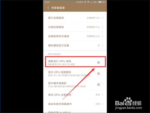 接着,我们在开辟者设置页面标的目的下滑动,找到“强制进行GPU衬着 ”按钮,点击打开它 。