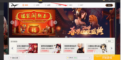 接下来会看到地下城的一些官方信息,在页面的上方有当作就/排行/补丁/战绩等等进口,点击排行进口,如下图所示