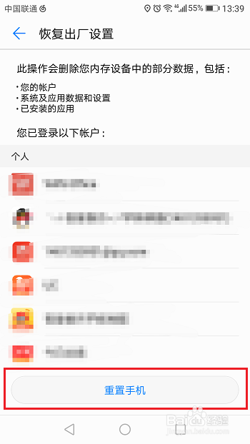 第三步进去恢复出厂设置界面之后,点击重置手机,一般不是手机硬件损坏,如许操作,手机相机城市恢复正常,如下图所示: