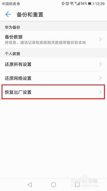 第二步进去设置界面之后,选择高级设置->备份和重置->恢复出厂设置,如下图所示: