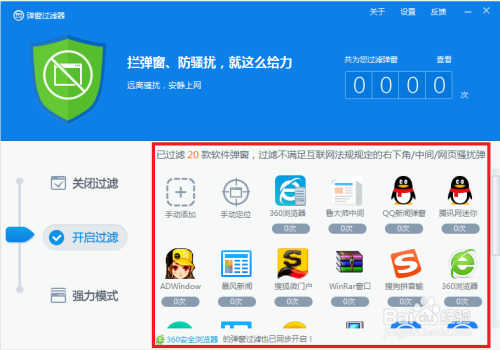 经由过程点击弹窗阻挡弹出窗口后经由过程在左侧选择开启或者封闭或者强力模式等信息,如下图所示,一般我们默认选择开启过滤就可以了,除特别要求除外。