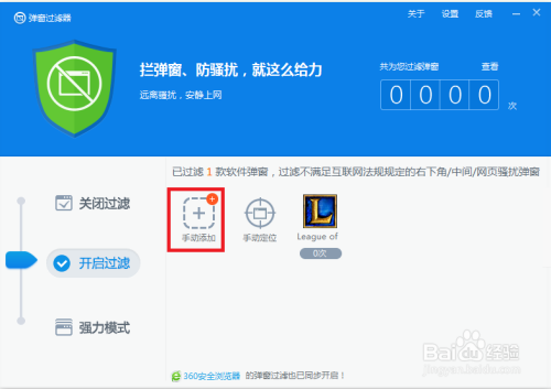接着经由过程点击手动添加来添加阻止弹窗的法式,经由过程点击开启过滤或者经由过程选择全选,如下图所示。