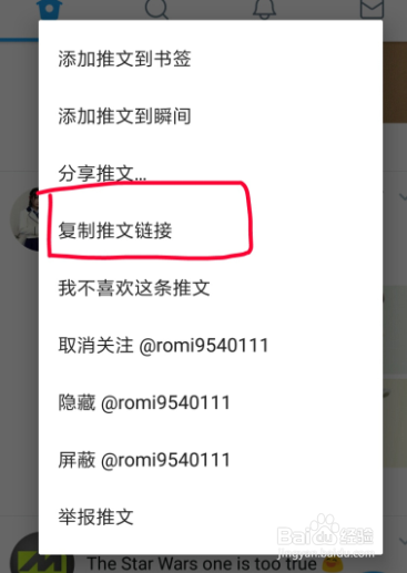 点击下图中的标的目的下的三角按钮,然后在弹出的菜单中选择复制推文链接,该内容的网址链接会被复制。