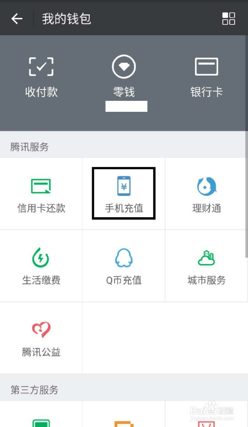 点击【钱包】后,看到【手机充值】点击进去,如图所示