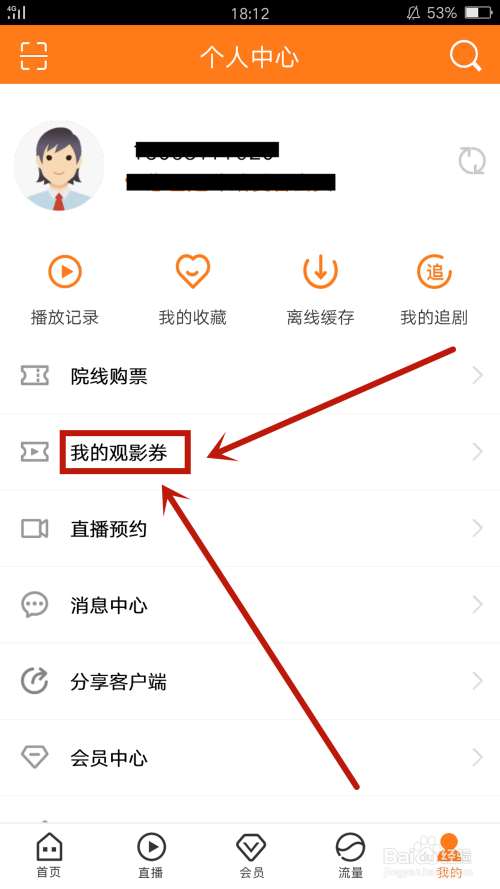 在小我中间,在点击“我的不雅影券”,如图所示