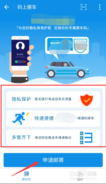 打开后,可以看到建造挪车码的益处,可以庇护小我隐私等,接着点击箭头指的“申请邮寄”按钮,申请相关套件。
