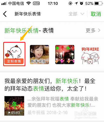 ①估量大都人都不知道其实微信脸色也是可以定制的吧?打开微信今后在首页的搜索框输入"新年欢愉""新春欢愉"等字眼,然后在搜刮成果中找到下方的相关搜刮"新年欢愉脸色",如下图;
