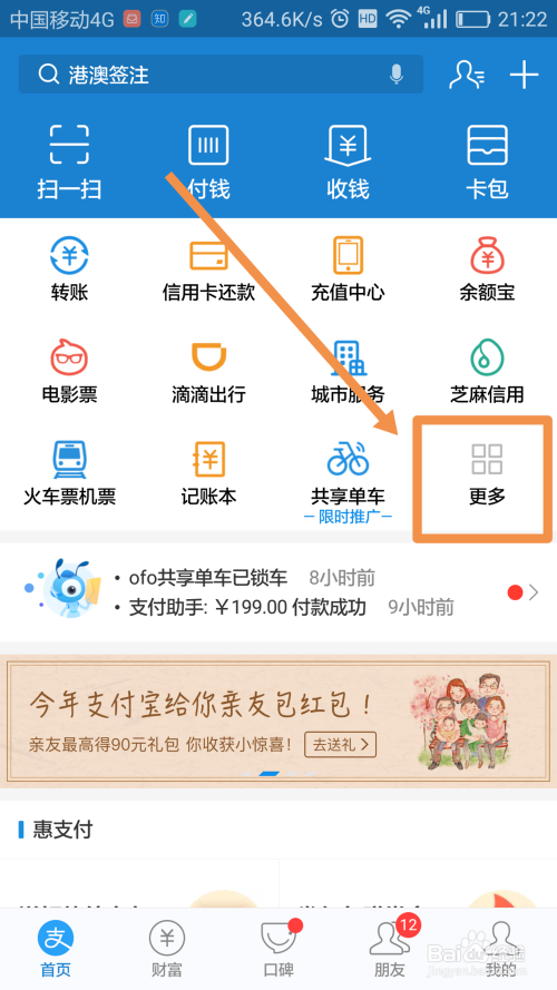 打开手机应用【付出宝】,在【首页】中找到【更多】并点击(如图)