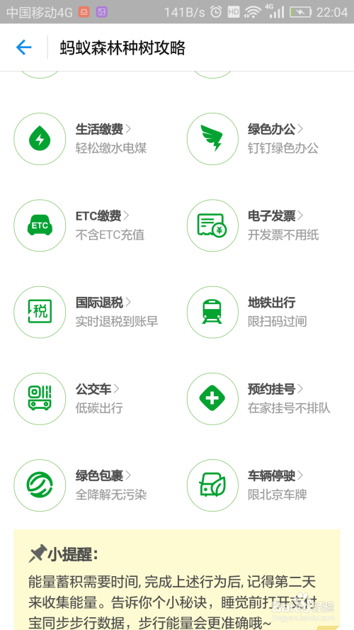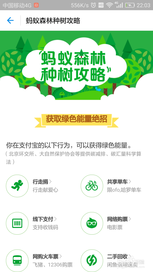 利用付出宝在线下付出、共享单车、采办火车票等都能发生绿色能量;
