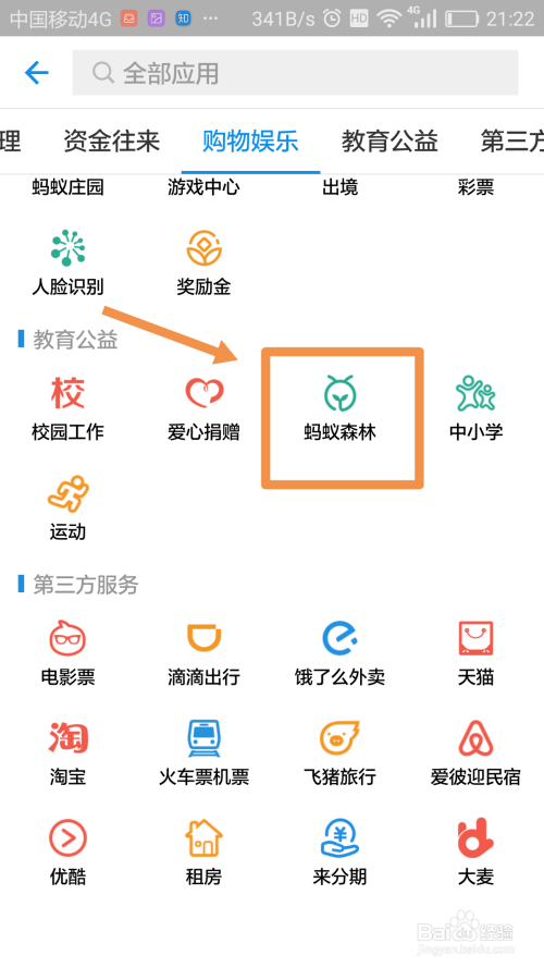 进入【全数应用】界面,在【教育公益】栏下找到【蚂蚁丛林】并点击,如图所示: