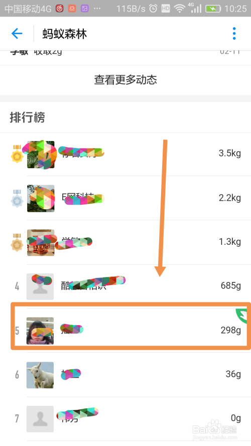 在排行榜中,可以查看到付出宝老友在蚂蚁丛林种树的绿色能量排行,如图所示: