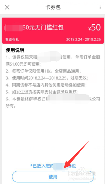 下图所示为打开优惠券后界面,阅读该券利用法则,点击界面下方“利用”即可利用该券。如许如何找到及利用获得的卡券,介绍完当作。