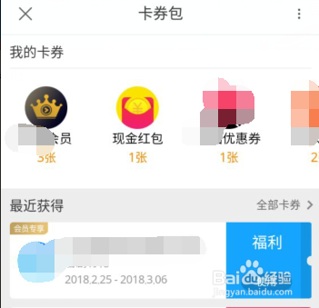 此时打开卡券包,可以看到近期获得的优惠,也可点击上方按钮,分类查看,这里任点击一张优惠券,即可打开其具体用法界面。