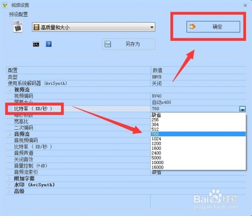在视频大小的下一个选项,是比特率(KB/秒),对应下拉菜单也有良多参数从小到年夜摆列。和视频大小的参数近似,数值越小,视频体积就越小,综合考虑,选择768就可以了。接着点击右上角确定按钮,完当作设置。
