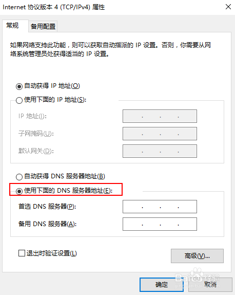 下图中,选择“利用下面的ip地址”,下面的DNS会主动切换到“利用下面的DNS办事器地址”