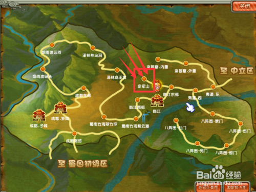 定军山位于临江东郊西海说神聊地域,从临江东郊右下传送口进入。如地图所示红色标识表记标帜,只有先达到临江东郊才能进入到特别地图。