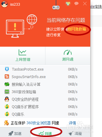 点击“网速”,再点击“断网急救箱”