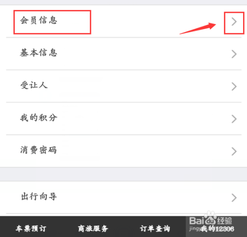 此时,在“我的12306”界面,多出“会员信息”选项,点击箭头所指符号,可以睁开该选项,看到“根基信息”、“受让人”等选项。