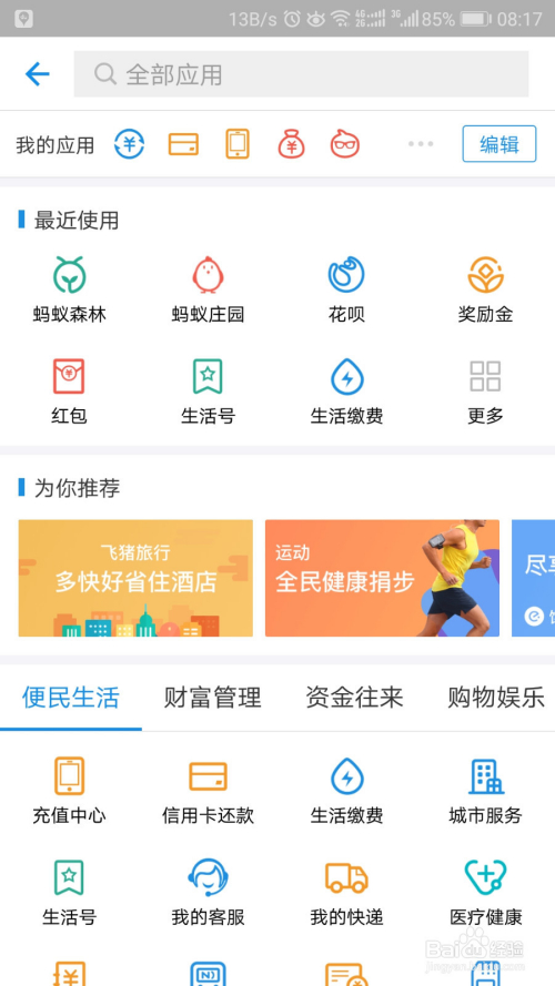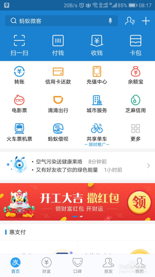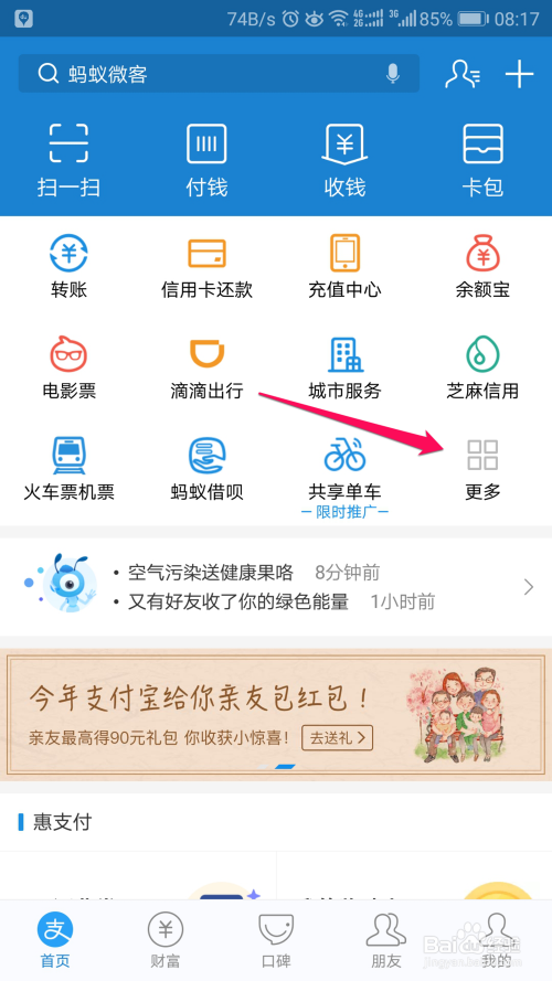 别的一种进入“蚂蚁丛林”的方式就是首先我们回退的第一步,就是在付出宝的首页,如下图: