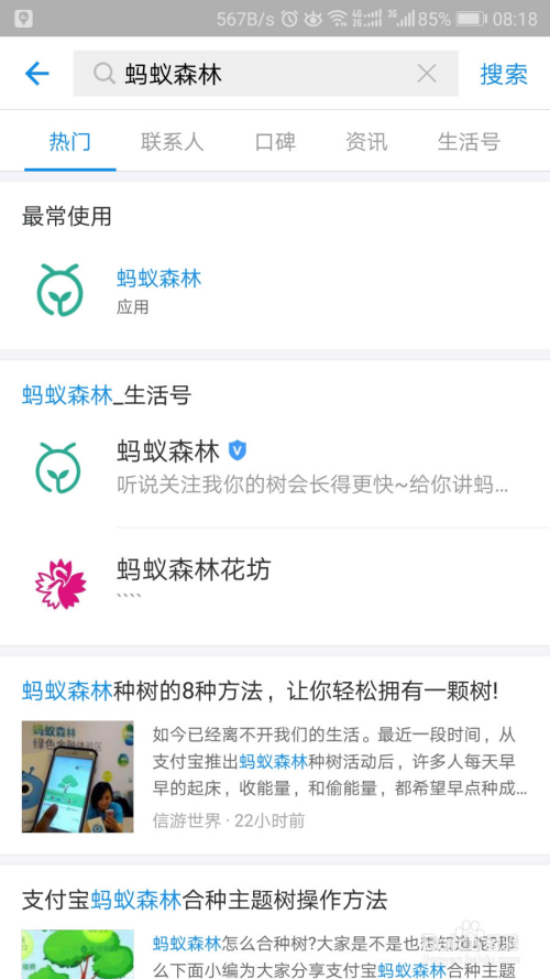 然后再首页的搜索框中我们输入“蚂蚁丛林”,然后进行搜刮,在搜刮的成果中我们就会看到熟悉的“蚂蚁丛林”了,这里需要注重的是我们日常平凡所说的“蚂蚁丛林”是一个应用,所以在搜刮成果中我们也是点击“蚂蚁丛林”应用,如下图: