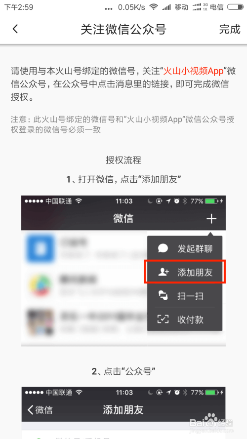 退出火山小视频,进入本身的微信,然后按以上提醒步调操作,添加伴侣、再进入公家号,然后进入所给网页,操作即完当作。如下图所示。