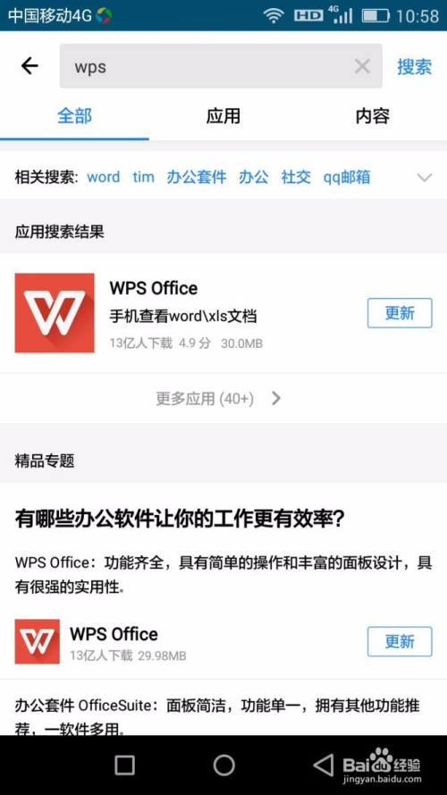 首先打开手机软件商铺或应用宝,然后输入WPS OFFICE,下载安装WPS OFFICE,若是已经下载有的话会提醒更新。