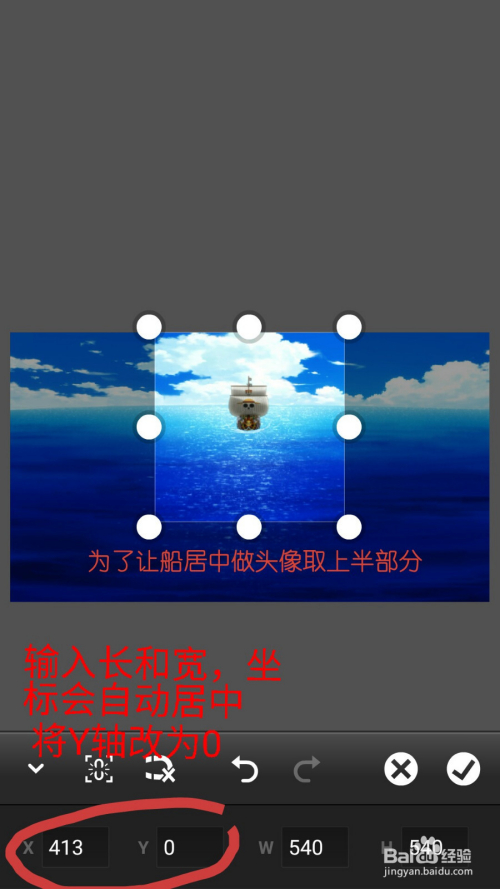 我这张图分辩率是1366*768,我这里想要桑尼号做头像,所以取长宽各540,Y轴为0,然后确定保留。布景图片就做好了。