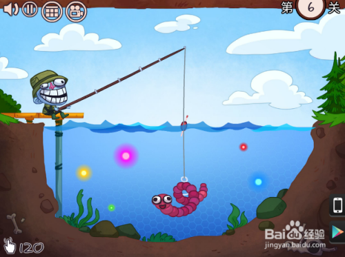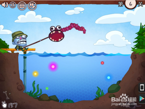 第六关,要吃失落这个小人。先把虫子从下往上划,等停下后,再沿着杆子从上往下划。