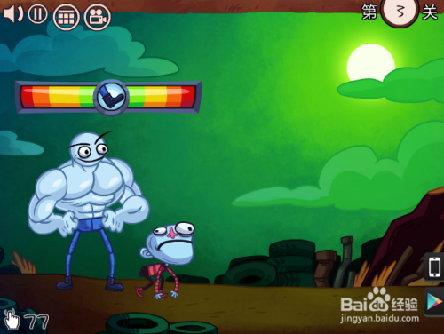 第三关,如何会踢不飞小人。鼠标往下划红衣服的小人然后等蓄力达到红时摆布时点上面的腿。