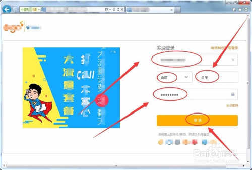 在接下来的登录界面中,输入宽带账号,选择“宽带”,输入并选择宽带的地点地,输入宽带密码和验证码,单击“登录”。