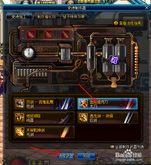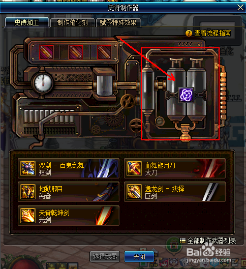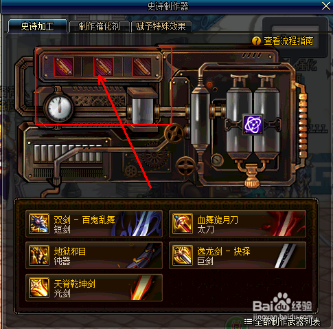 打开史诗建造器,选择史诗加工,在这里我们可以选择我们玩的职业对应该的兵器,好比剑类职业的可以选择”血舞旋月刀“等,具体如下图所示: