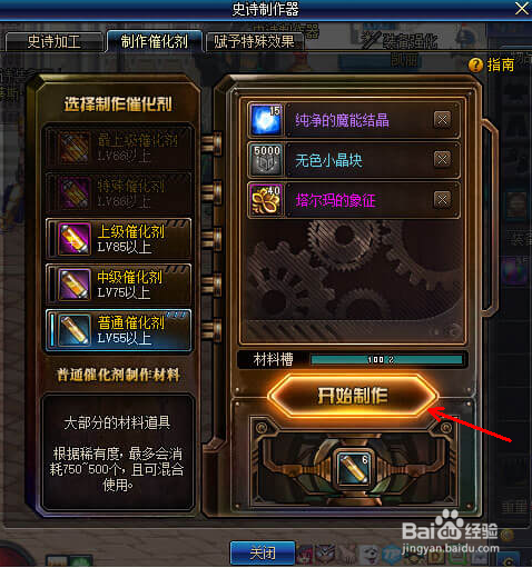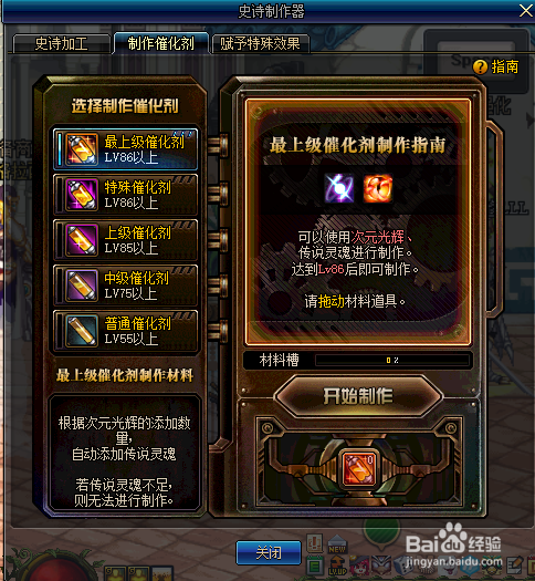 史诗建造用的催化剂是可以建造的,且没有次数限制,可以肆意建造。选摘要 建造的催化剂后,将道具从物品栏拖放到右侧的材料栏,具体如下图所示: