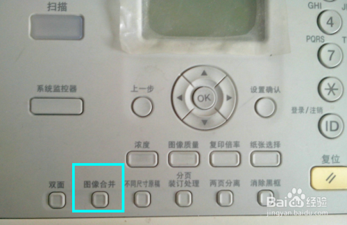 找到复印机上的一个按钮【图像归并】。归并的意思就是将身份证的正背面归并在统一页纸上。