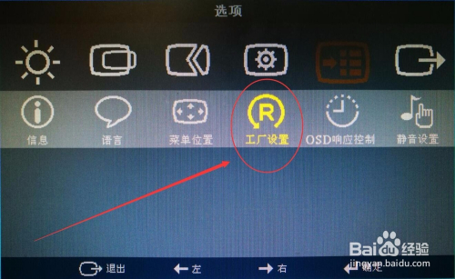 按下显示器上的标的目的右键,直到选中“工场设置”子选项。