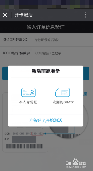 输入你收到的卡的ICCID的后七位,并输入你的身份证后六位,然后按下一步