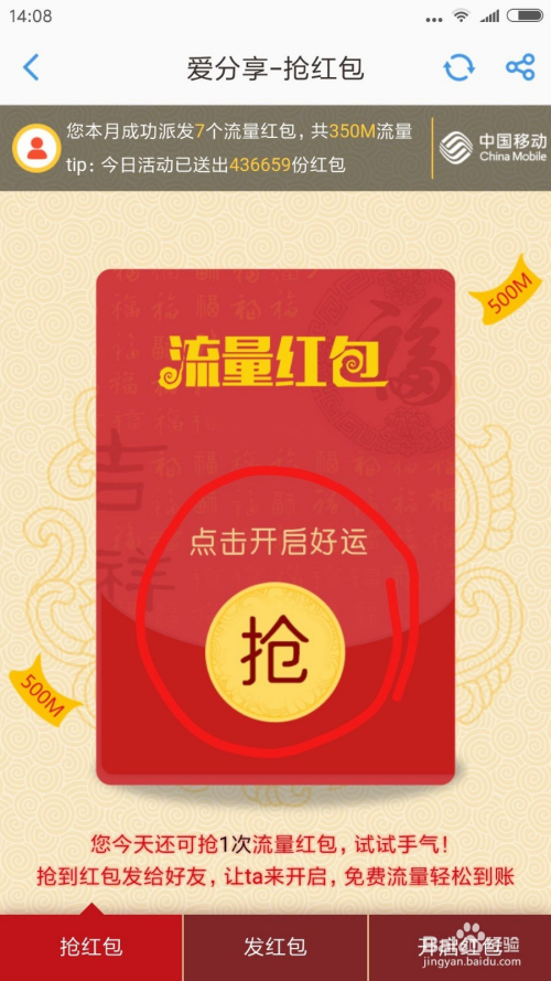 首先点开四川移动APP,如图点击爱分享抢流量红包,然后点击抢流量红包的抢。