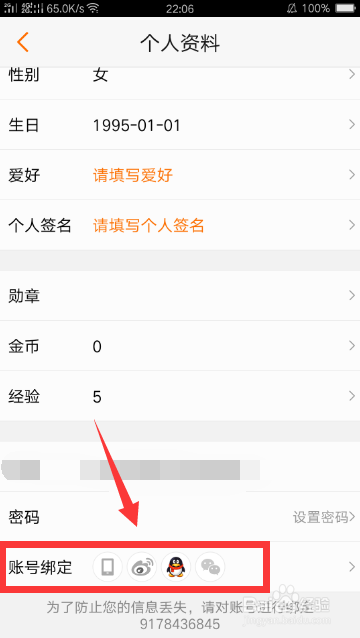 【账号绑定】的页面,会显示手机没有绑定,点击进入手机。