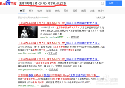 第二:在百度展示栏里的第一页顶端我们找到“王菲和那英合唱《岁月》纯享版MP3下载”,点击进入。