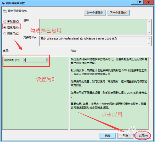 弹出限制可保留带宽界面,勾选择已启用,点窜带宽限制为0,点击应用即可