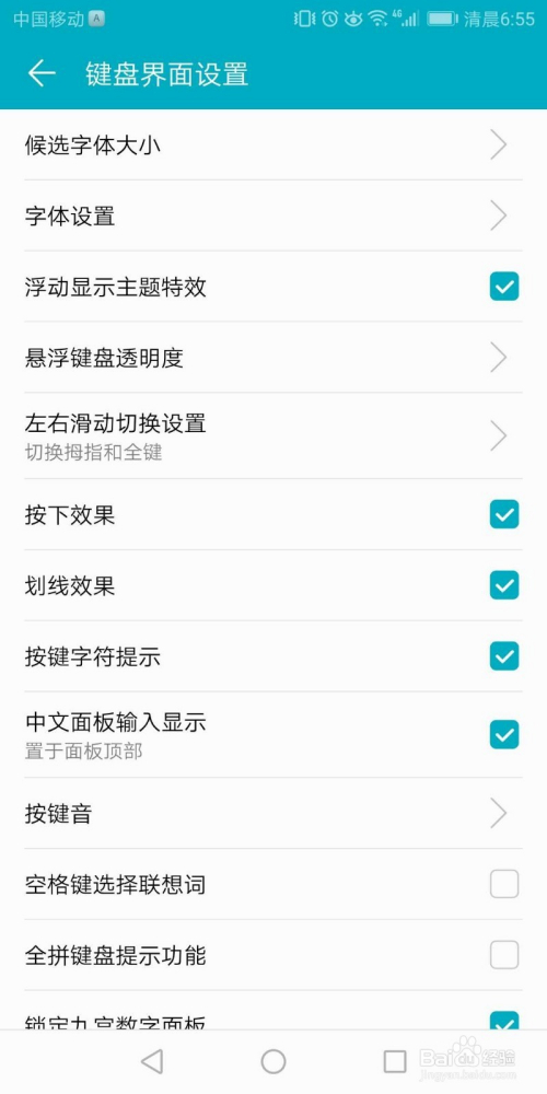 点击进入键盘界面设置。此处可以调整字体大小、悬浮键盘透明度等。
