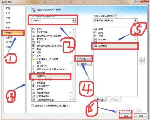 本教程中以添加常用号令“建立图表”为例,具体操作流程如图中序号所示。