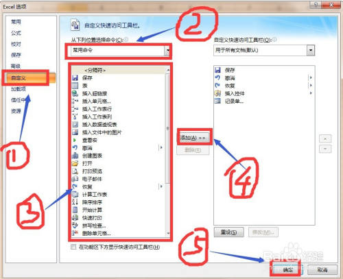 选中在Excel选项的“自界说”栏,在号令框中找到我们需要设置快捷键的号令,然后点击添加,如图所示,号令呈现在右边的自界说快速拜候东西栏中,点击确认保留设置。