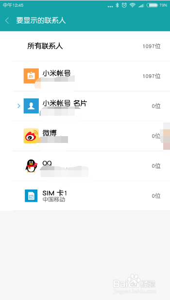 在步调五中弹出的窗口中选择"分账户显示”,可以设置显示的账户,如所有账户的所有联系人、SIM卡、QQ、小米账号等。一般选择最上方的“所有联系人”。