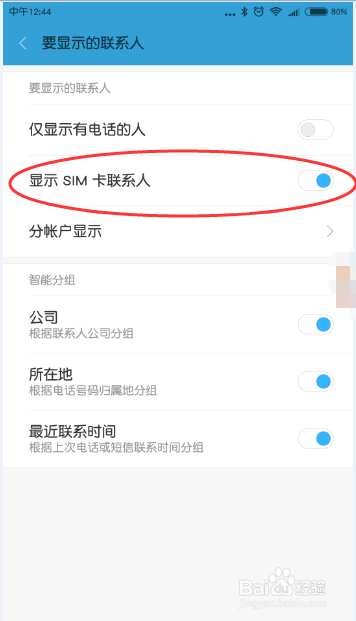 在弹出的窗口,选择“显示SIM卡联系人”,即可在联系人中显示出SIM卡上的联系人。