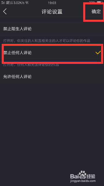 最后再点击“禁止任何人评论”这一项,点击“确定”即可。