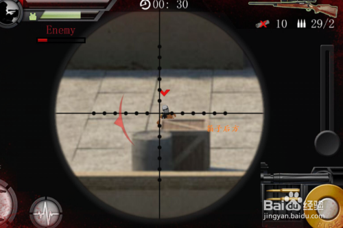 年夜楼右侧的狙手移速会很快,一两秒会伸出一次身影,不易打的准,此时只要瞄准这里,期待出来时击灭他即可。