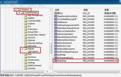 CurrentVersion\Policies\Explorer 项,然后看右侧睁开项,有没有一个叫做“Nodesktop”的项,若是有这个项的,请双击这个项,然后弹出键值设置,请把键值设置为0,确定或者选中“Nodesktop”项,右键------删除