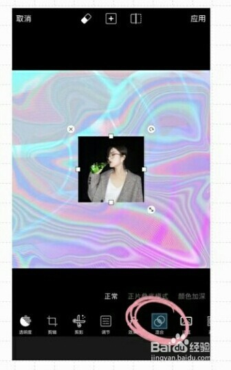 调整完底图点击添加照片,选择铺盖上去的本家儿图,鄙人方的功能选择"夹杂"