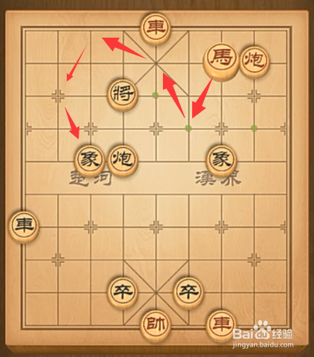 首先,马按照箭头符号行走把象吃了,再按照原路跳回来。