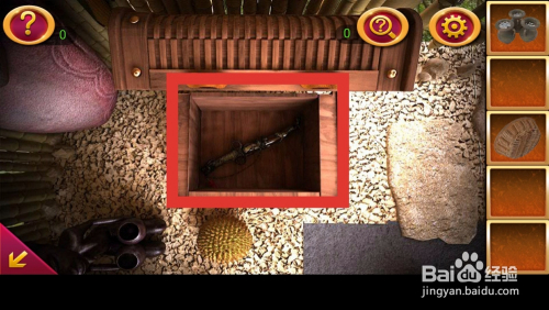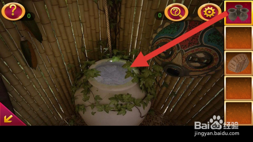 再次点击右边角落的年夜罐子,用刀将年夜罐子后面的绳索砍断,获得绳索